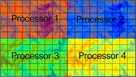 Assign processors to different regions and apply the appropriate calculus equations